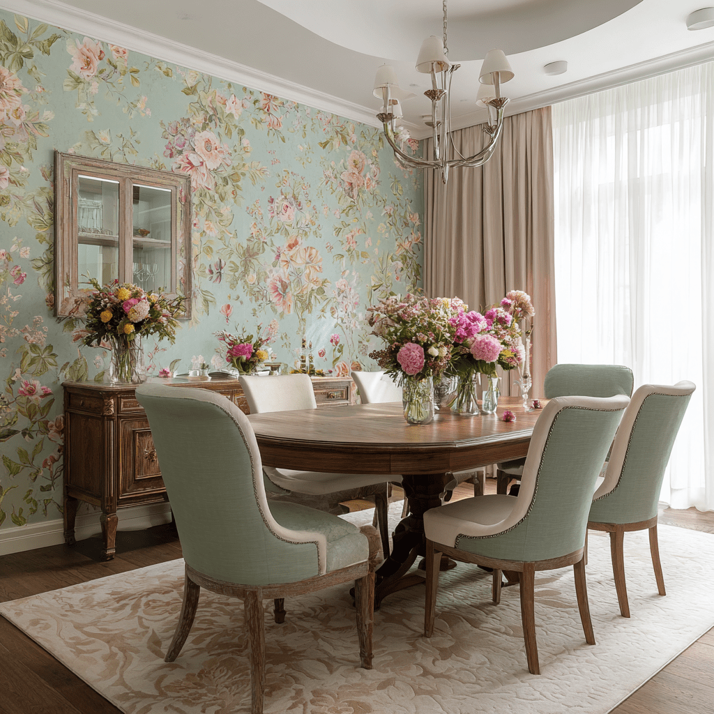 Wallpaper is a versatile way to create an accent wall reflecting your dining room’s style. Vintage-inspired floral wallpaper adds charm, while modern geometric patterns offer a bold touch. Removable wallpaper is great for frequent design changes or renters.