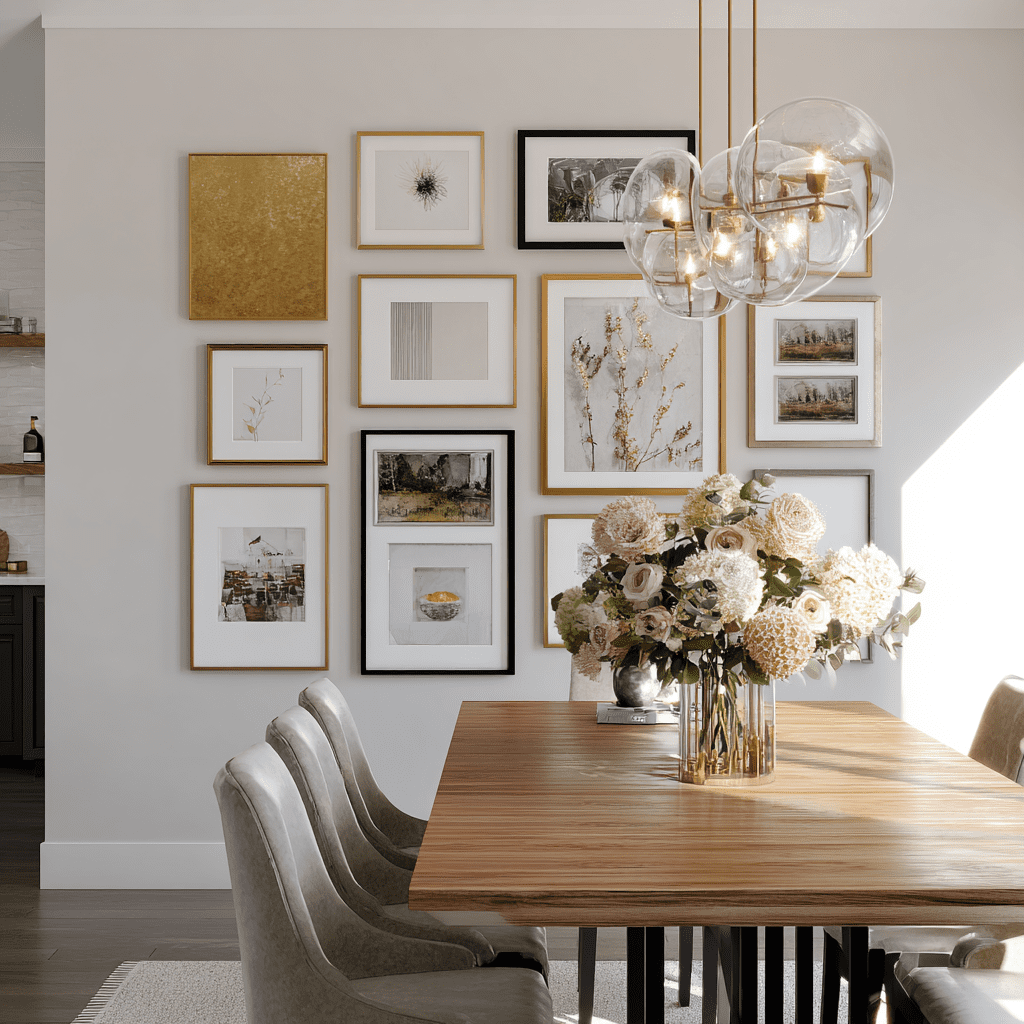 Carefully select and arrange your favorite pieces. Add thoughtful lighting design to create a stunning gallery wall. This personalized display showcases your style and adds sophistication to your dining room.
