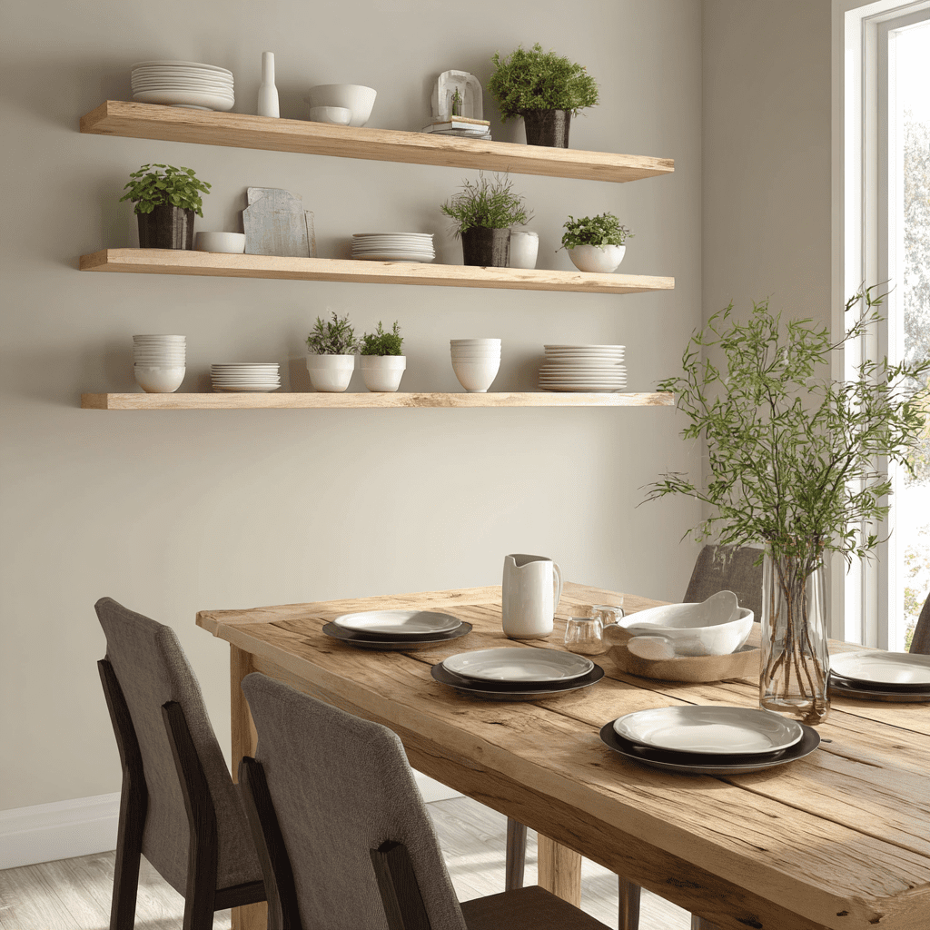 Mix and match different textures and materials on decorative shelves. This creates a rich and inviting atmosphere in your dining space. Add a lush potted plant for a touch of nature.