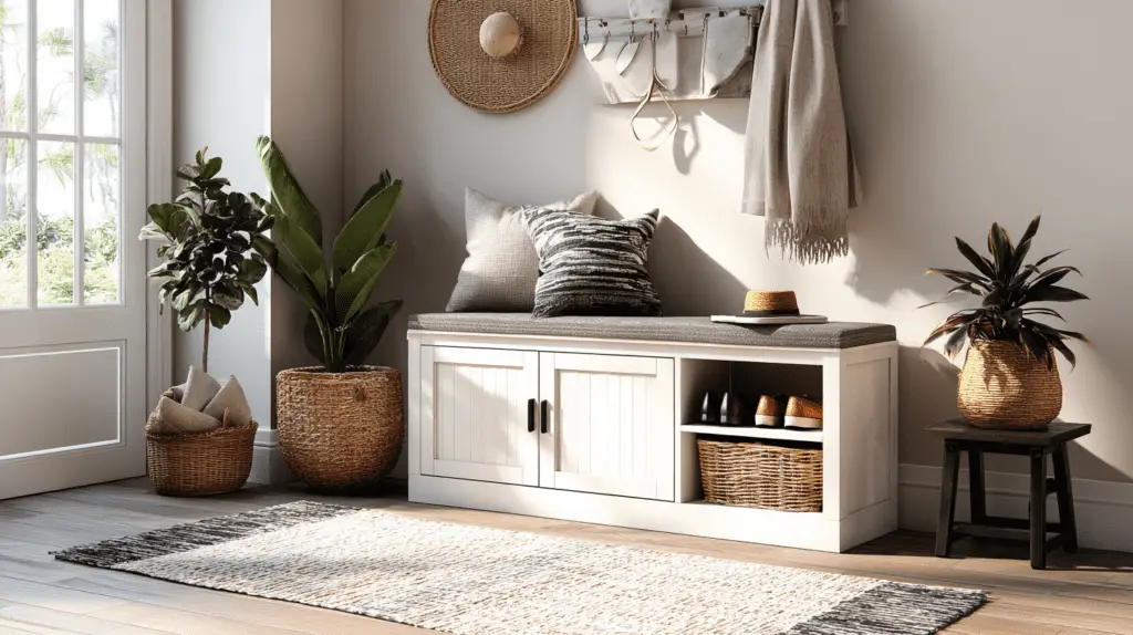 A shoe storage bench is the ultimate clutter-tamer for busy homes. It gives you a comfy place to sit while hiding shoes out of sight. Clean entryway, zero effort.