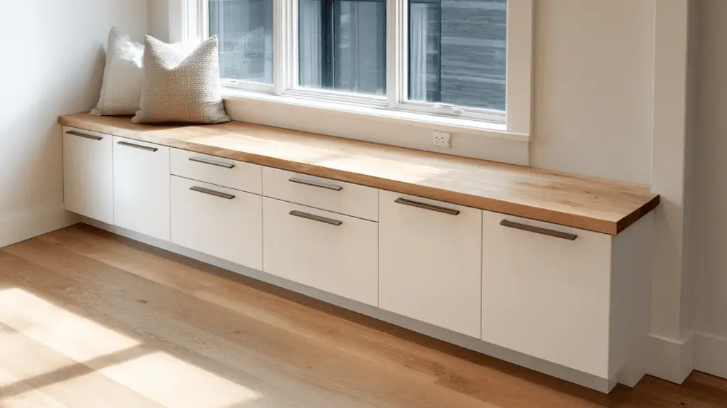Short on space? A fold-down wall bench disappears when not in use. It’s one of those genius solutions that feels almost magical.
