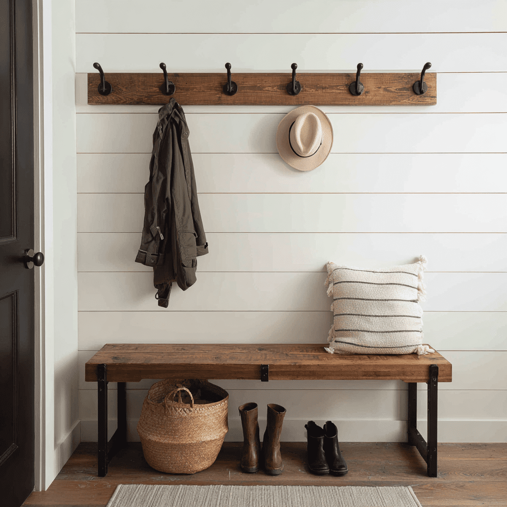 This is storage on storage. A bench with hooks handles coats, bags, and shoes in one neat zone. It’s like an entryway command center.