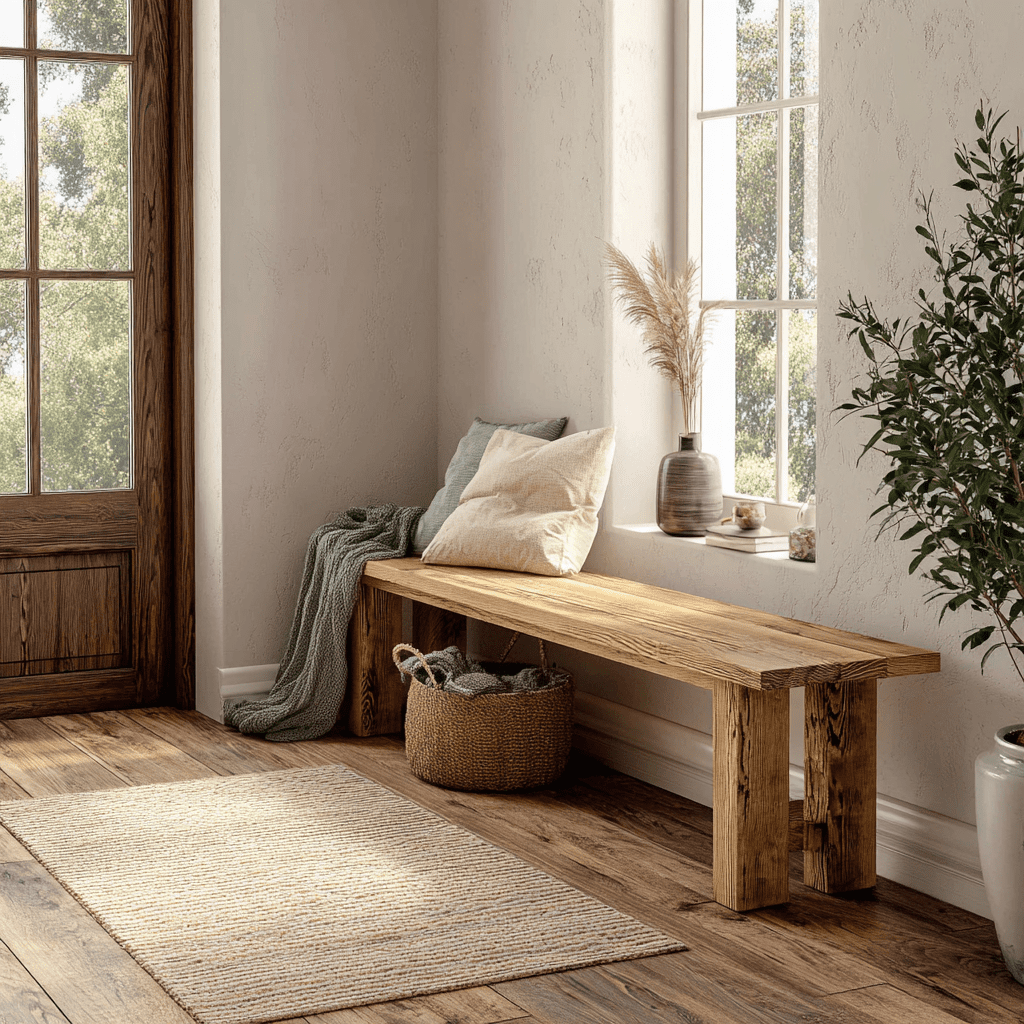 A rustic wooden bench adds warmth and charm instantly. It’s simple, sturdy, and never goes out of style. Bonus points if it’s reclaimed wood.