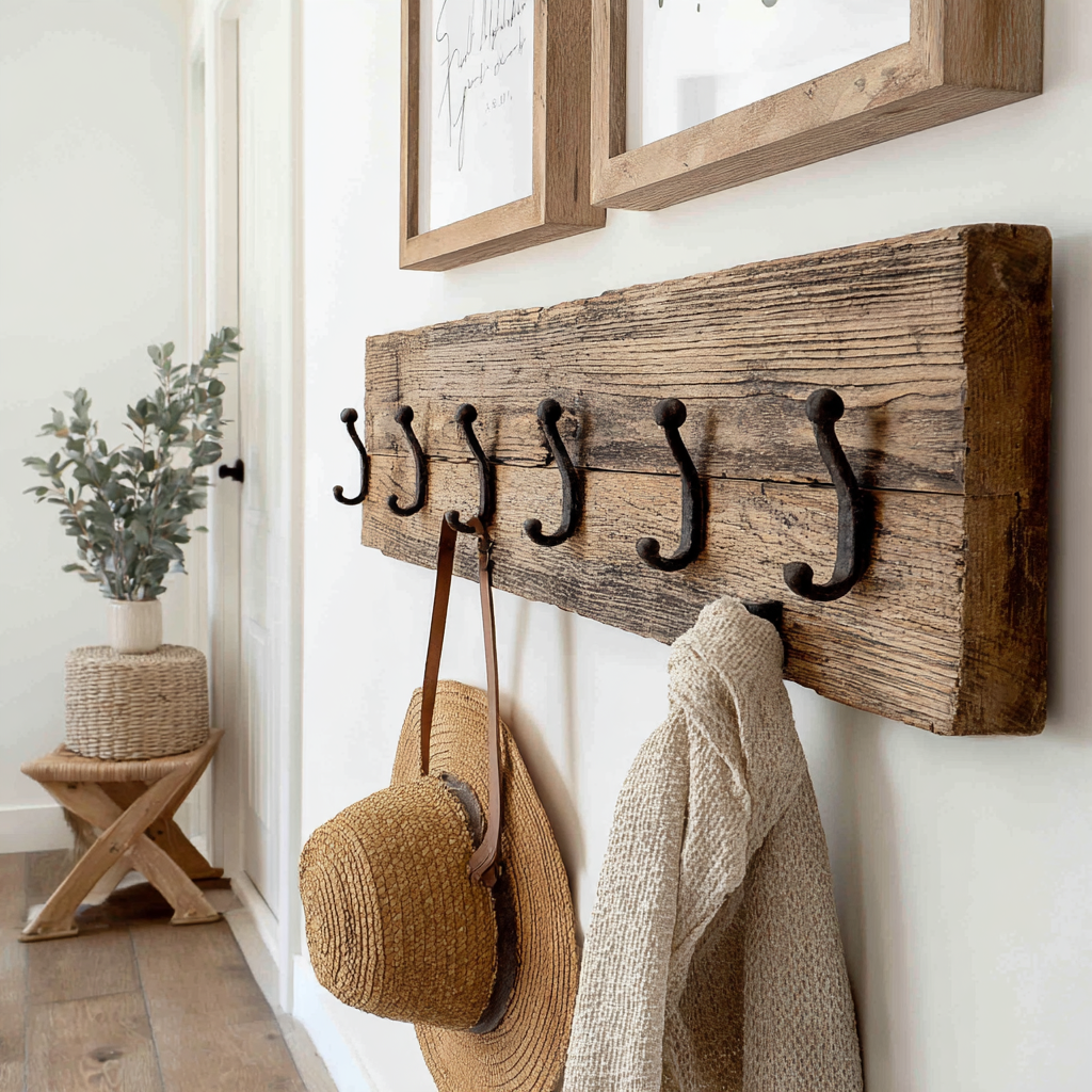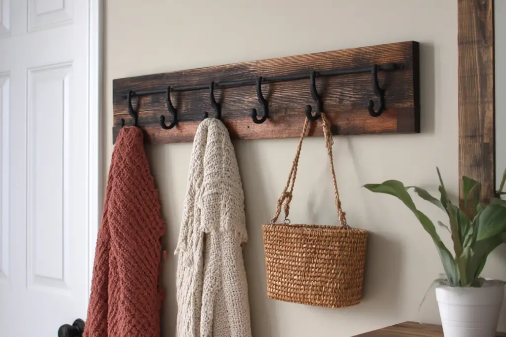 A rustic hook board brings charm to your entryway with distressed wood, antique-style hooks, and a cozy lived-in vibe. It’s functional, sure, but it also adds character right away. If your home leans farmhouse, vintage, or cottage, this one’s a match made in heaven.