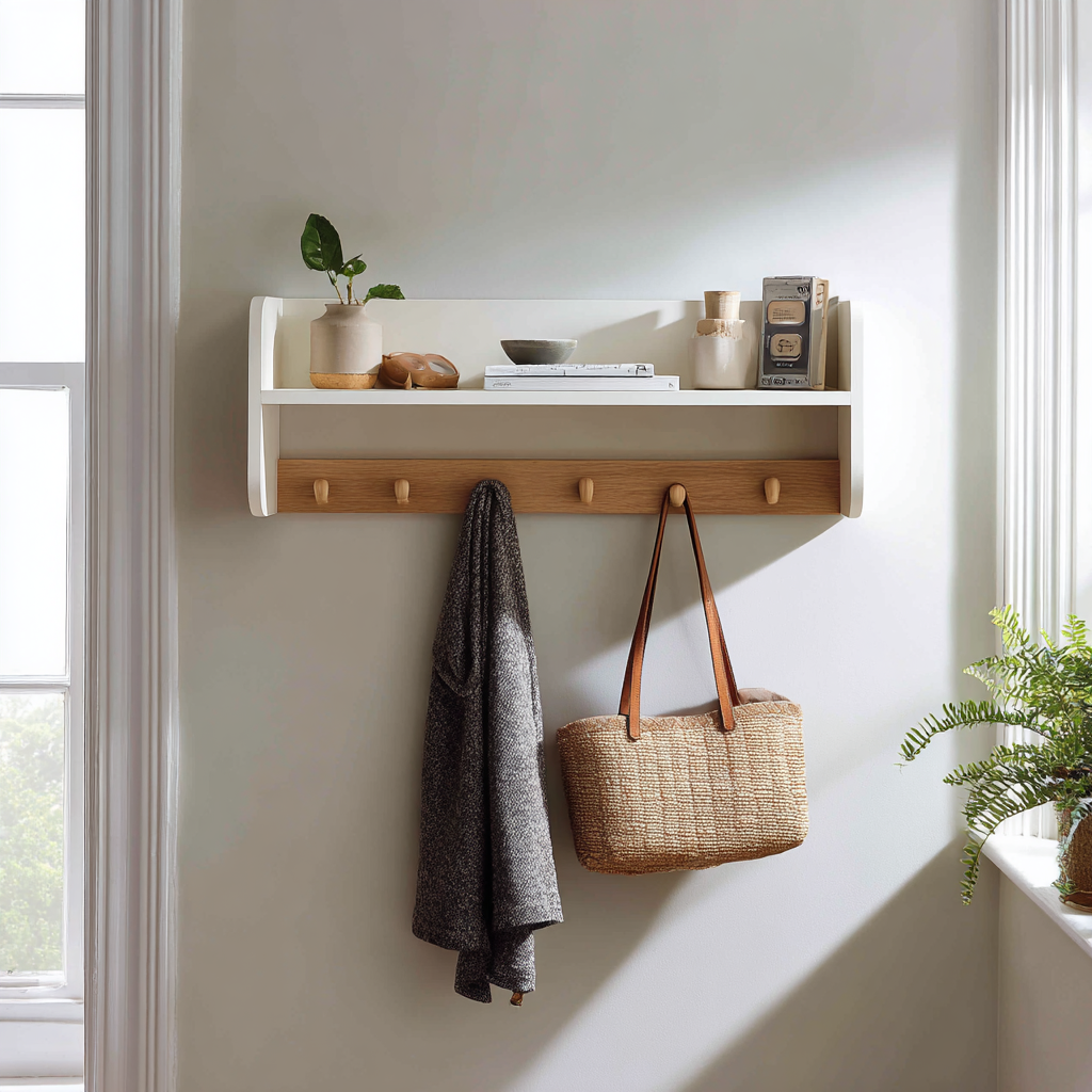 A wall-mounted wooden shelf with built-in hooks gives your entryway instant structure. It’s basically a small landing spot for keys, wallets, sunglasses, and all the extras you grab on the go. The hooks keep your keys visible, so you’re not digging around at the worst moment.