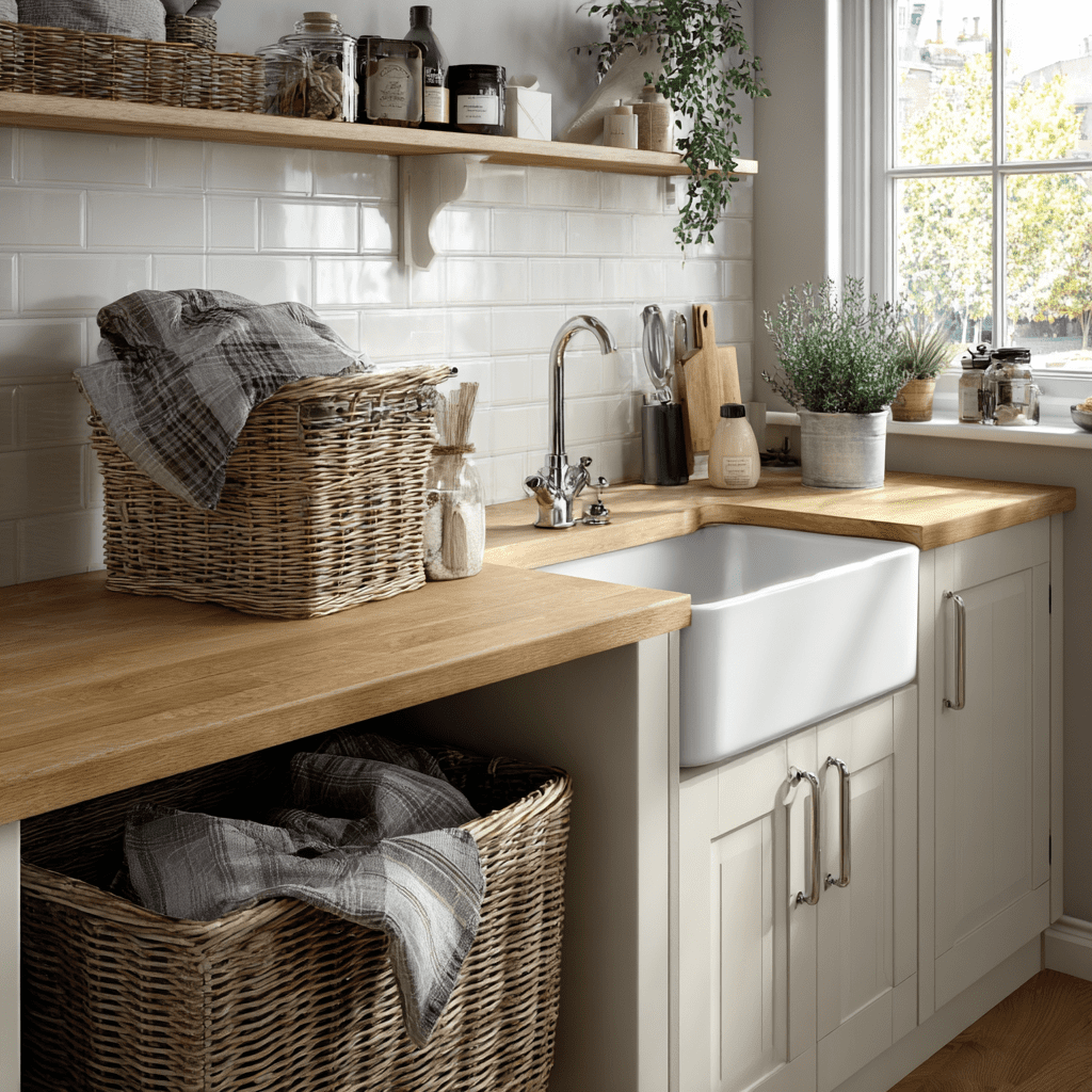 Line open shelving with labeled seagrass or water hyacinth baskets. They corral cleaning supplies while adding natural texture that plastic bins can’t match. I’ve had mine for years—they hold up amazingly well to daily use.