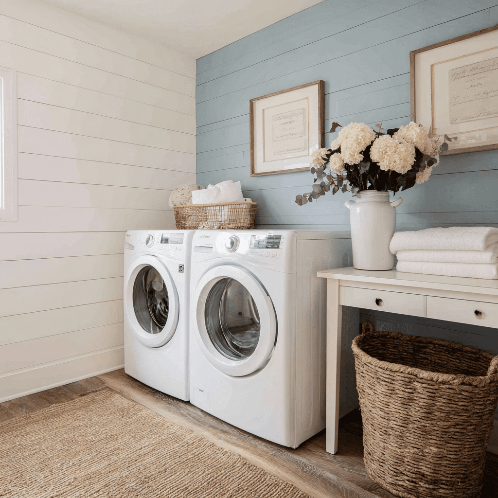 Add instant character with a shiplap wall behind your washer and dryer. This wood-planked look creates dimension without overwhelming the space. Try Sherwin Williams Blustery Sky for a subtle blue that adds calm to laundry days.