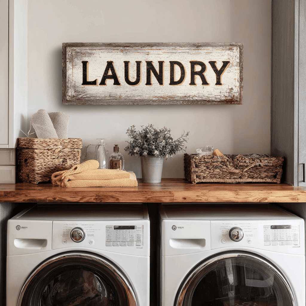 Hang a distressed “Laundry” sign with weathered edges above your machines. The best ones come from flea markets rather than big box stores—I’ve found authentic vintage pieces for under $30 that add genuine character.