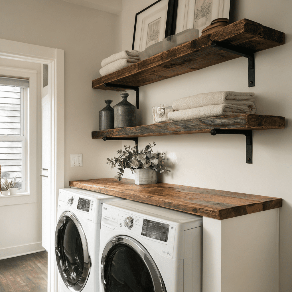 Install rustic wooden shelves with iron brackets above your machines. Reclaimed barn wood works beautifully here, adding warmth while providing essential storage for laundry basics without closed-in cabinetry that feels too modern.