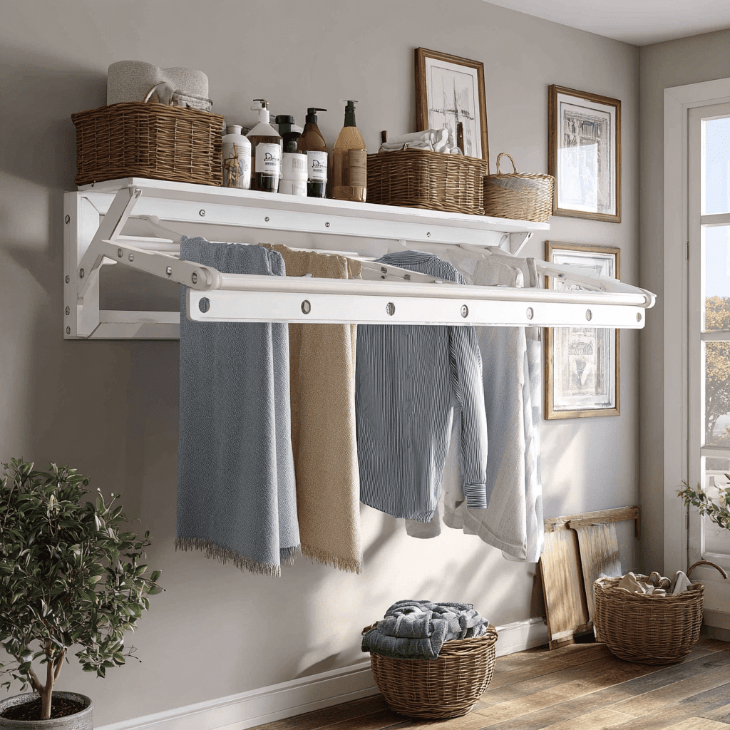 Mount a fold-down wooden drying rack that disappears against the wall when not in use. These wall-mounted solutions save valuable floor space while maintaining that vintage laundry room feel—they’re surprisingly easy to DIY!