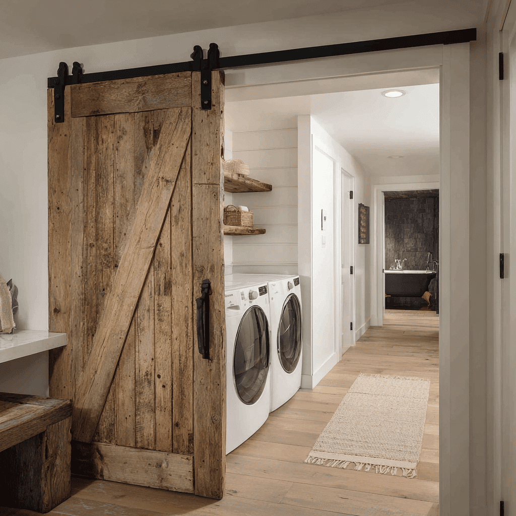 Replace that boring door with a sliding barn door on exposed hardware. It’s a space-saving solution that screams farmhouse style. The hardware alone transforms the room, even if you can’t swing a solid wood door.