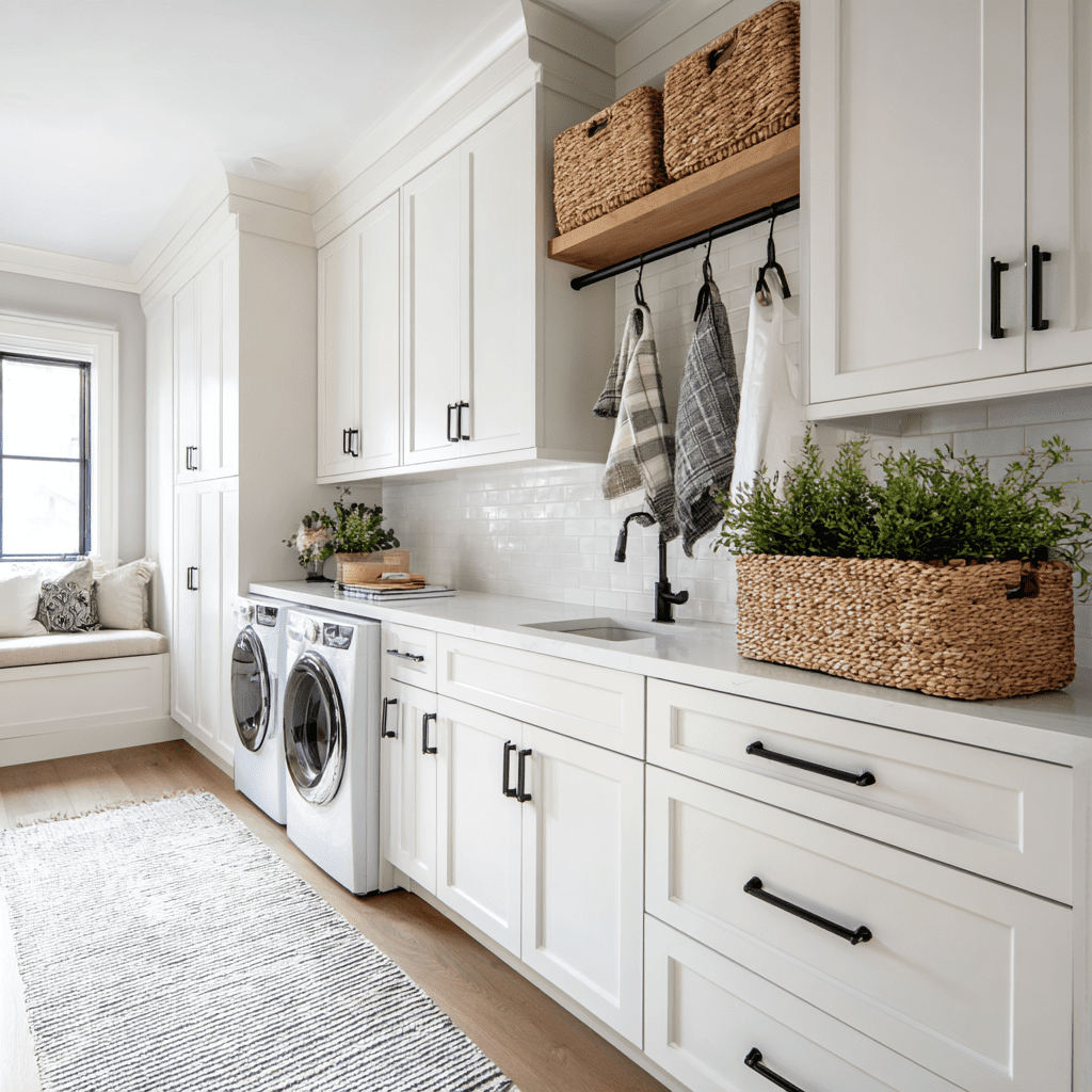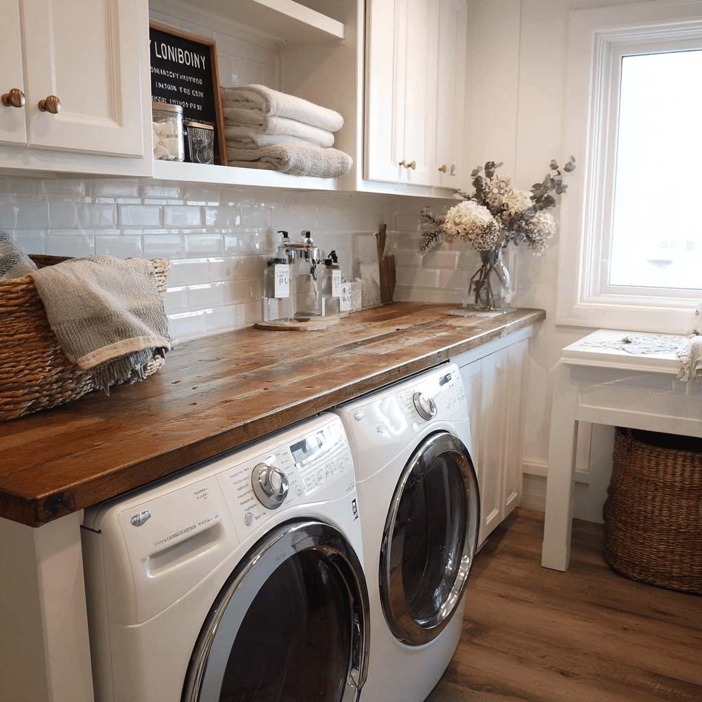 Install warm wood butcher block over your washer/dryer. They’re practical for folding while adding organic warmth to balance white appliances. A quick monthly mineral oil rub keeps them looking gorgeous despite humidity.