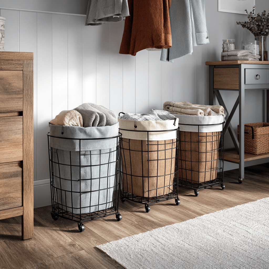 Replace plastic hampers with metal wire baskets on wheels. They look straight from an old-fashioned laundromat while being incredibly functional. Line with removable canvas bags for easier transport to bedrooms.
