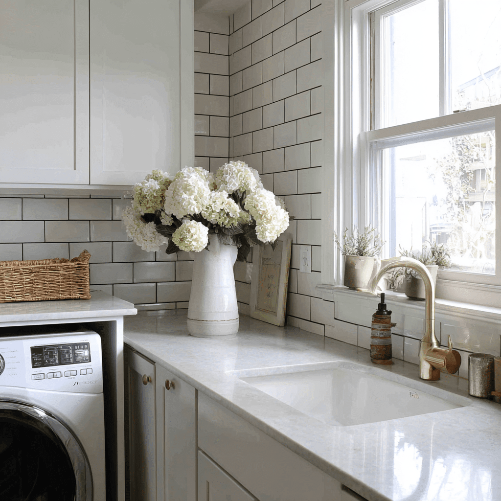 Install classic white subway tile behind your sink area. This timeless look protects walls while adding subtle texture. Try light gray grout instead of white—it hides dirt better in a working laundry space.