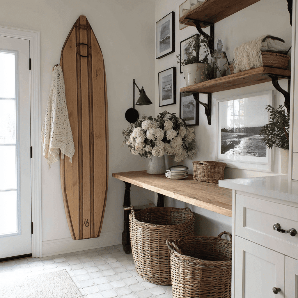 Mount an antique washboard as wall art—a cheeky nod to laundry days past. These conversation pieces can still be found at antique shops for $20-40, bringing authentic history to your walls rather than mass-produced “farmhouse” decor.