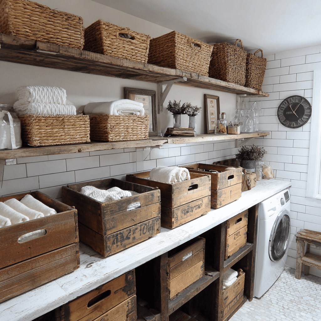 Repurpose old crates as wall-mounted shelving or under-sink storage. These weathered containers add instant age while corralling cleaning supplies. The more authentic the stamps and markings, the better the farmhouse feel.