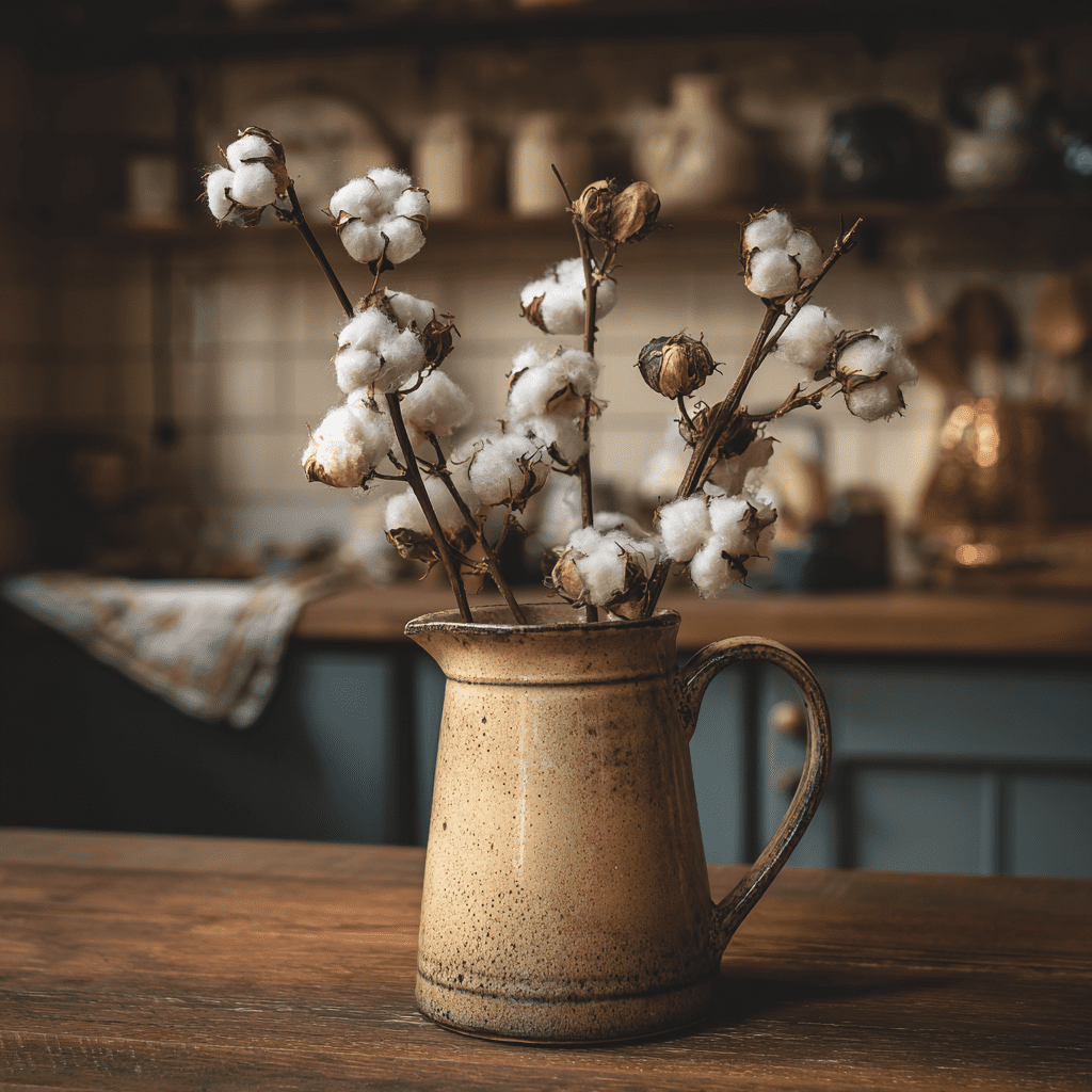 Place dried cotton stems in a vintage pitcher for subtle seasonal decor. These fluffy white blooms are laundry-themed without being obvious, adding wonderful texture that softens the utilitarian nature of the space.
