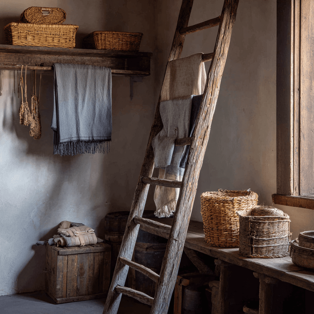 Lean an old wooden ladder against a wall for clothes-drying with major farmhouse appeal. Sand the edges just enough for safety but preserve that worn patina. Perfect for hanging delicates or displaying pretty linens when not in use.