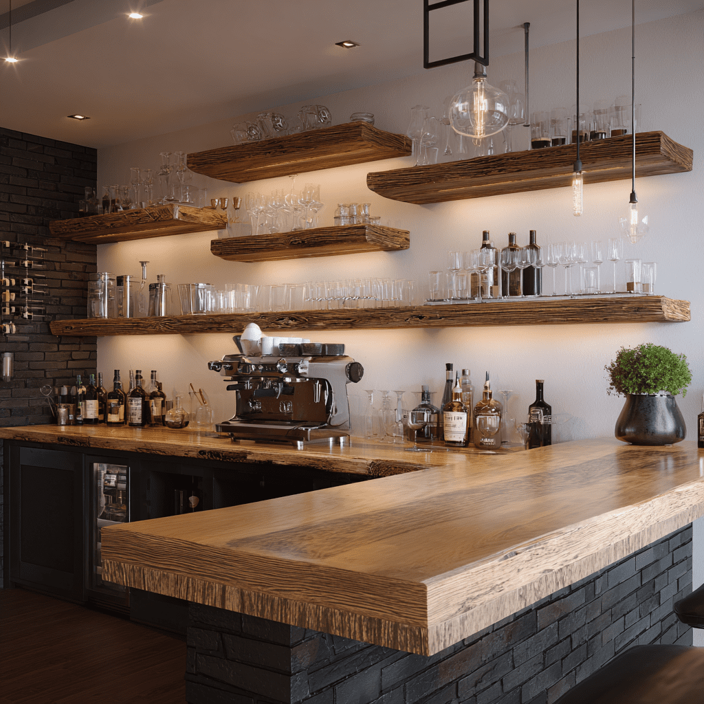- Floating shelves for bottles.