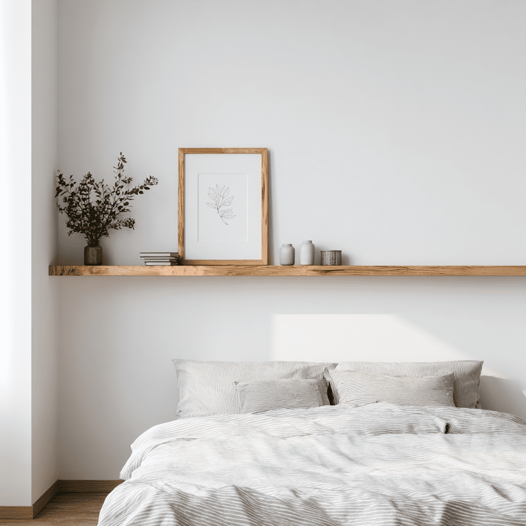 A slim wooden floating ledge keeps things clean and calm, perfect if clutter stresses you out. It gives you a spot for framed art, plants, or a clock without screaming for attention. IMO, it’s the safest choice if you want style without risk.