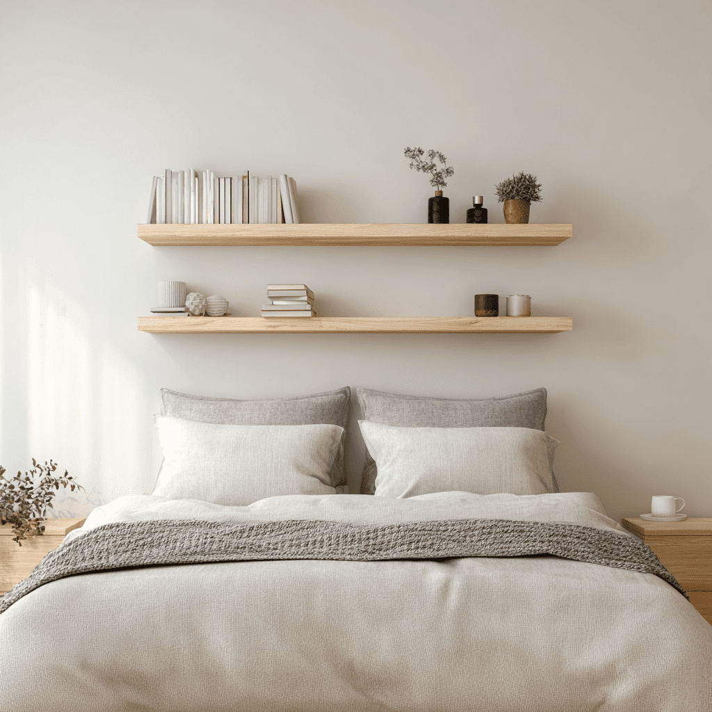 Mount a longer shelf low enough to act as a floating nightstand above the bed line. It’s unexpected but super practical if side tables feel bulky. Plus, cleaning underneath becomes ridiculously easy.