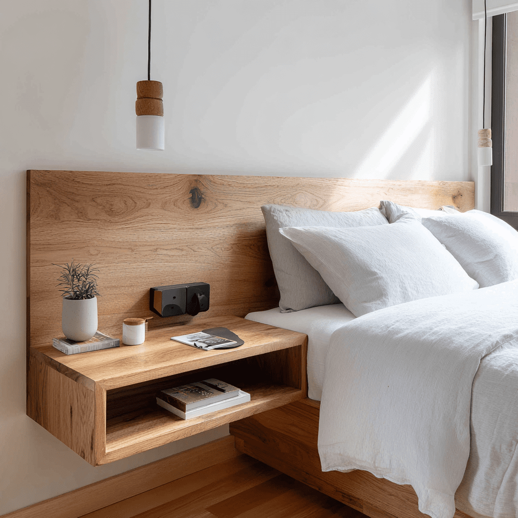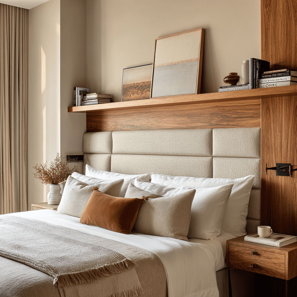 Think of this as a headboard upgrade. A floating shelf attached just above the headboard blends storage and design in one move. It’s practical for books and personal items while keeping everything within reach. FYI, it feels custom without custom pricing.