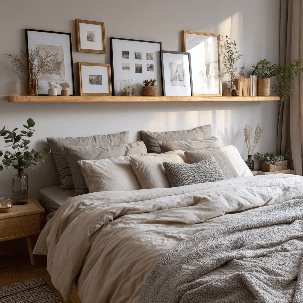 Picture ledges are shallow shelves made for art, but they shine above beds. You can layer frames, photos, and even small plants without committing to nail holes everywhere. Switch things up whenever the mood hits.