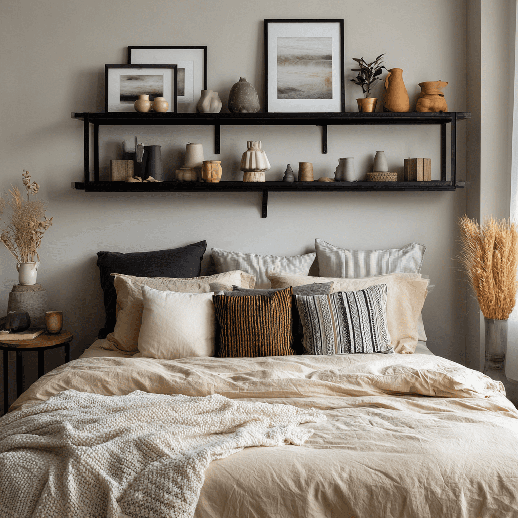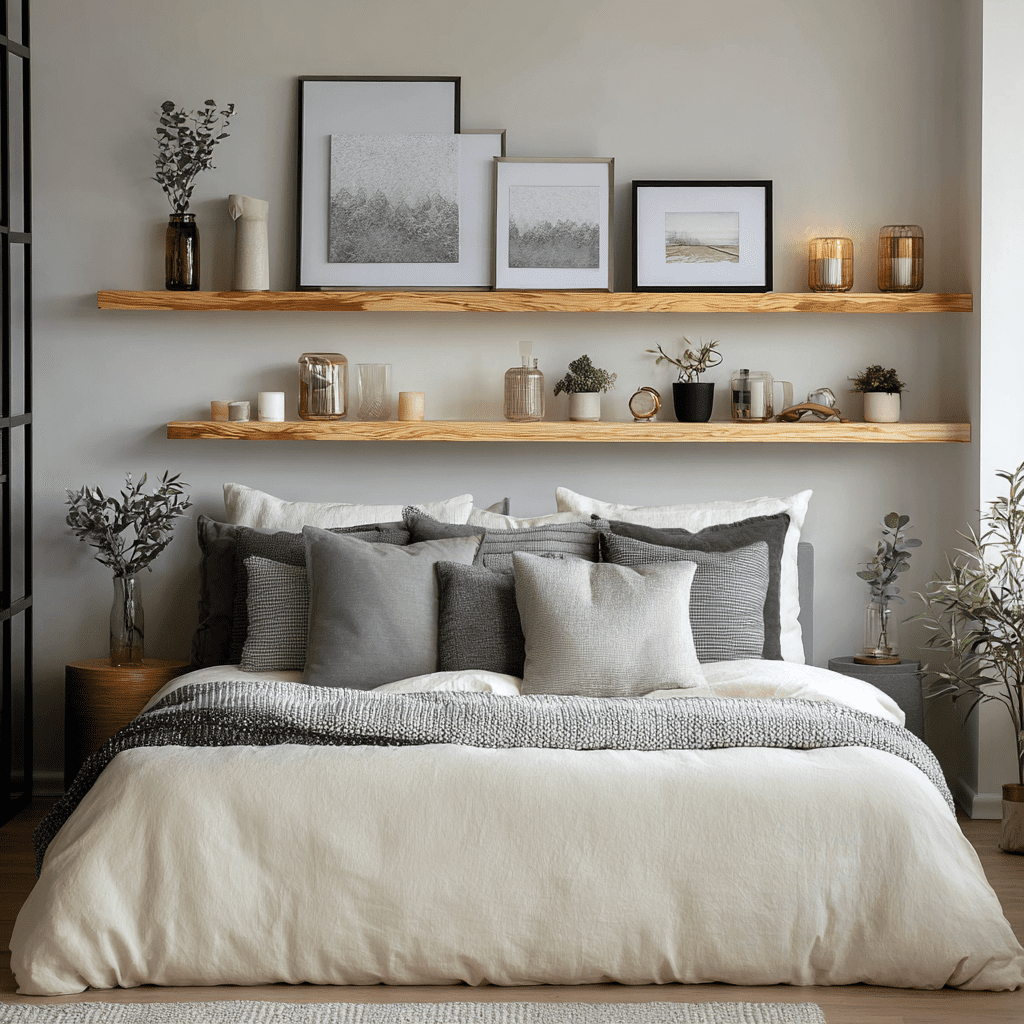 Who says shelves need to match? An asymmetrical floating shelf arrangement adds personality and movement above your bed. It feels creative, not chaotic, when colors and spacing are consistent.