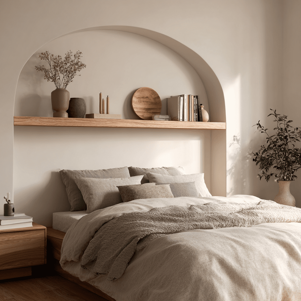 An arched floating shelf instantly softens the wall above your bed and adds a designer touch. It breaks away from straight lines, which makes the space feel more relaxed and styled on purpose. If your room feels boxy, this is an easy fix that still keeps things functional.