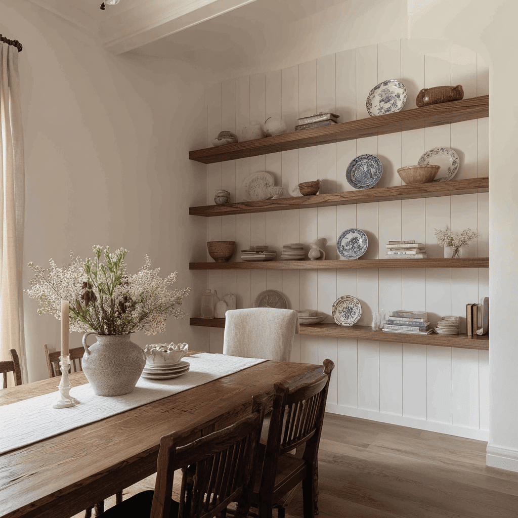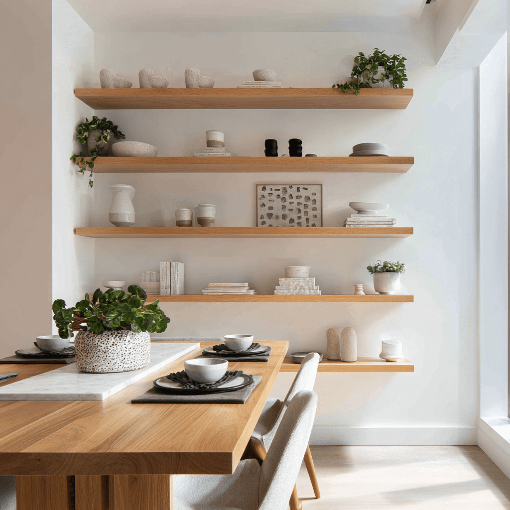 These shelves are all about simple elegance. They blend into the dining room while still giving you space for plates, bowls, or a few plants. IMO, this is the safest option if you want something timeless.