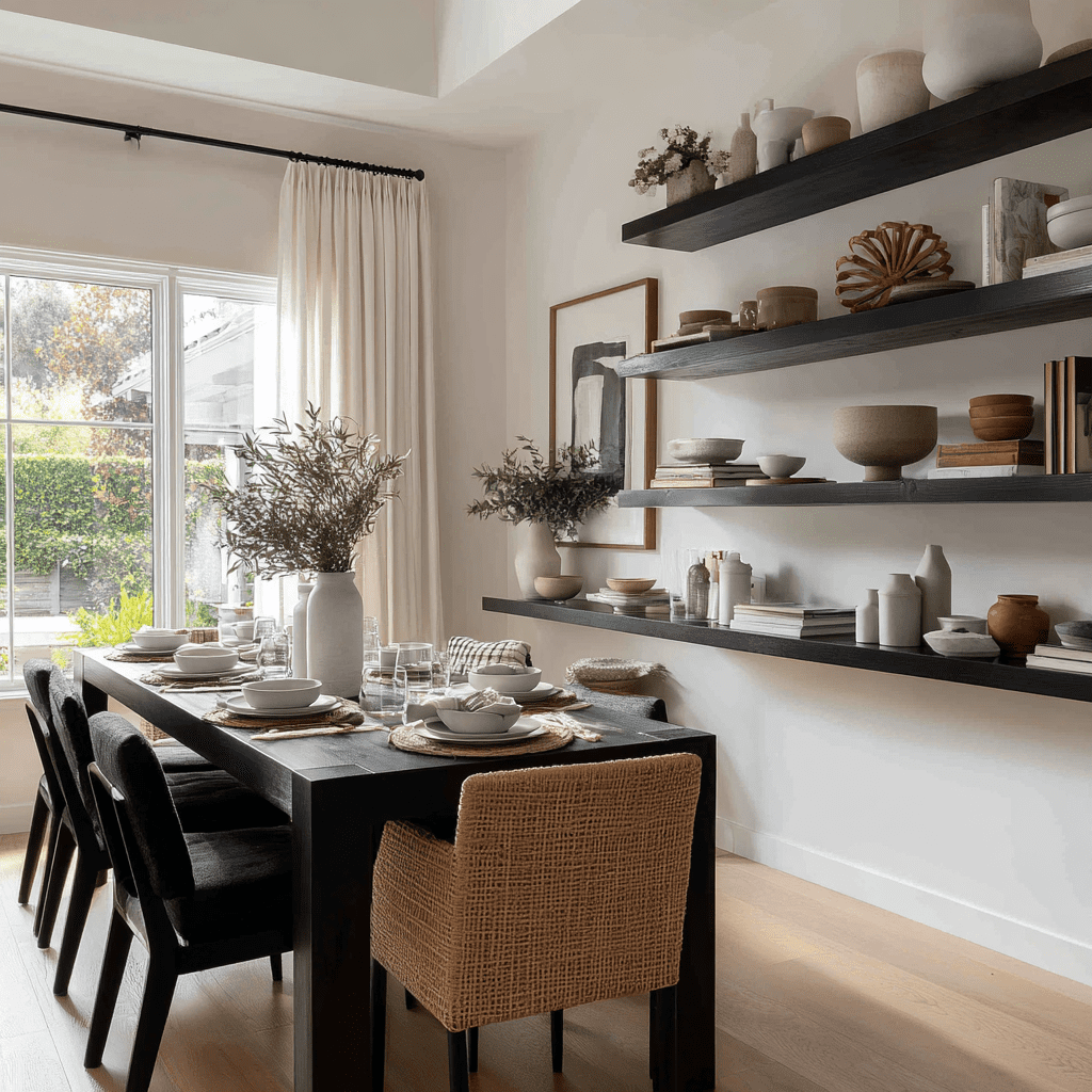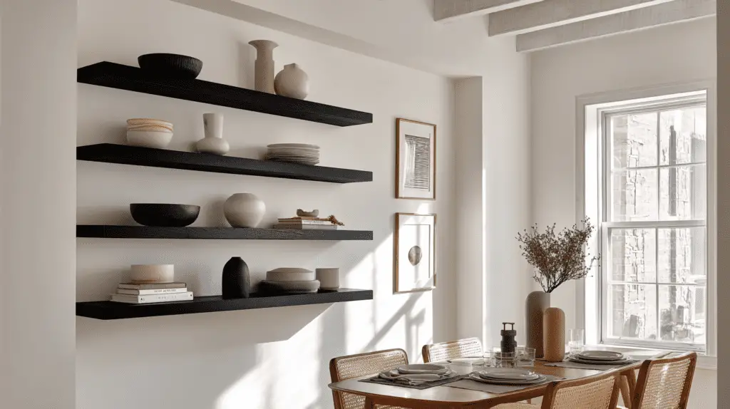 Dark floating shelves instantly create contrast, especially against light walls. They’re great for making your dining room feel bold and intentional, not boring.