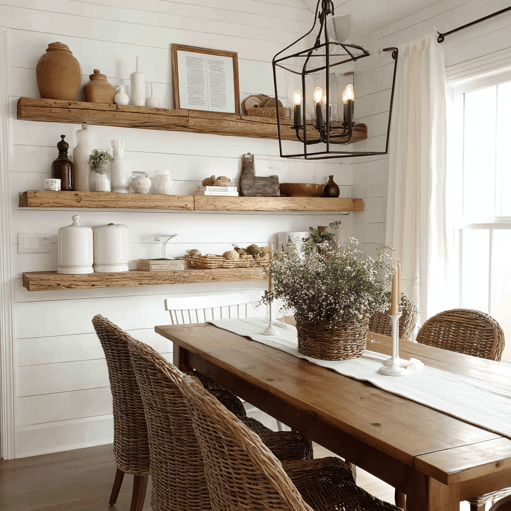Rustic floating shelves bring that farmhouse charm everyone loves. Think reclaimed wood, chunky brackets, and a lived-in feel that makes dinners feel more relaxed.