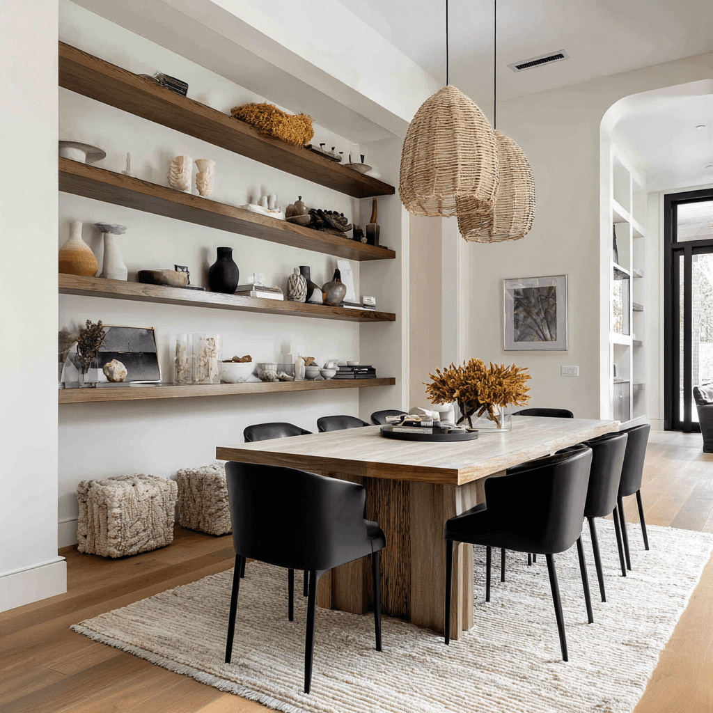 Built-in style floating shelves give your dining room a custom, high-end vibe. They often run floor-to-ceiling or wall-to-wall, creating a seamless look.