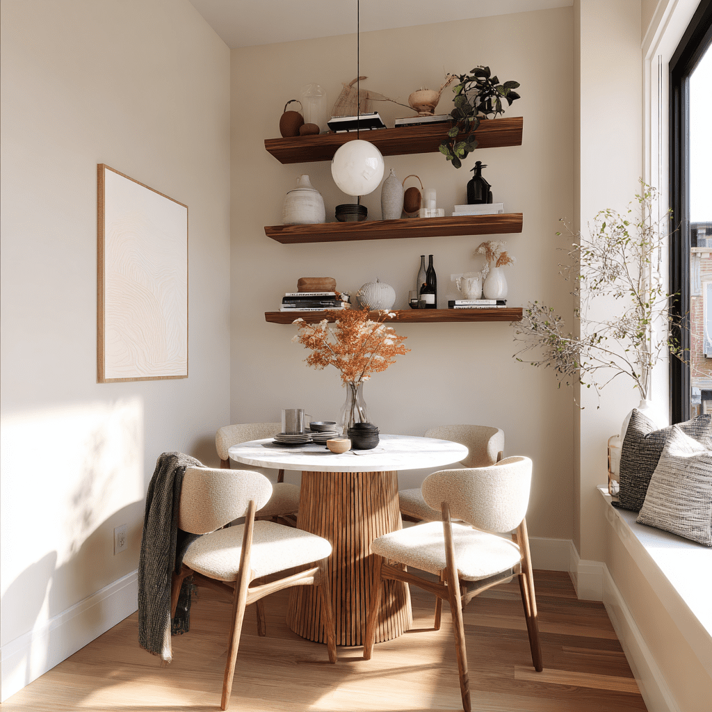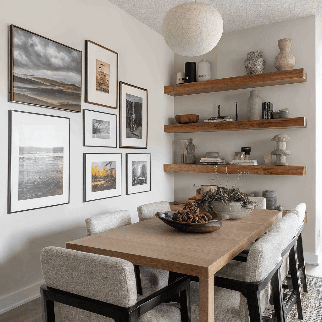 Floating shelves layered with framed art give your dining room a curated, gallery-like feel. It’s great if you love switching decor seasonally.