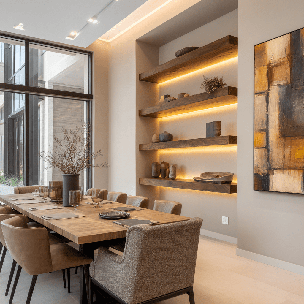 Adding LED strips or puck lights under floating shelves makes the dining room feel warm and intentional. It’s functional and stylish at the same time.
