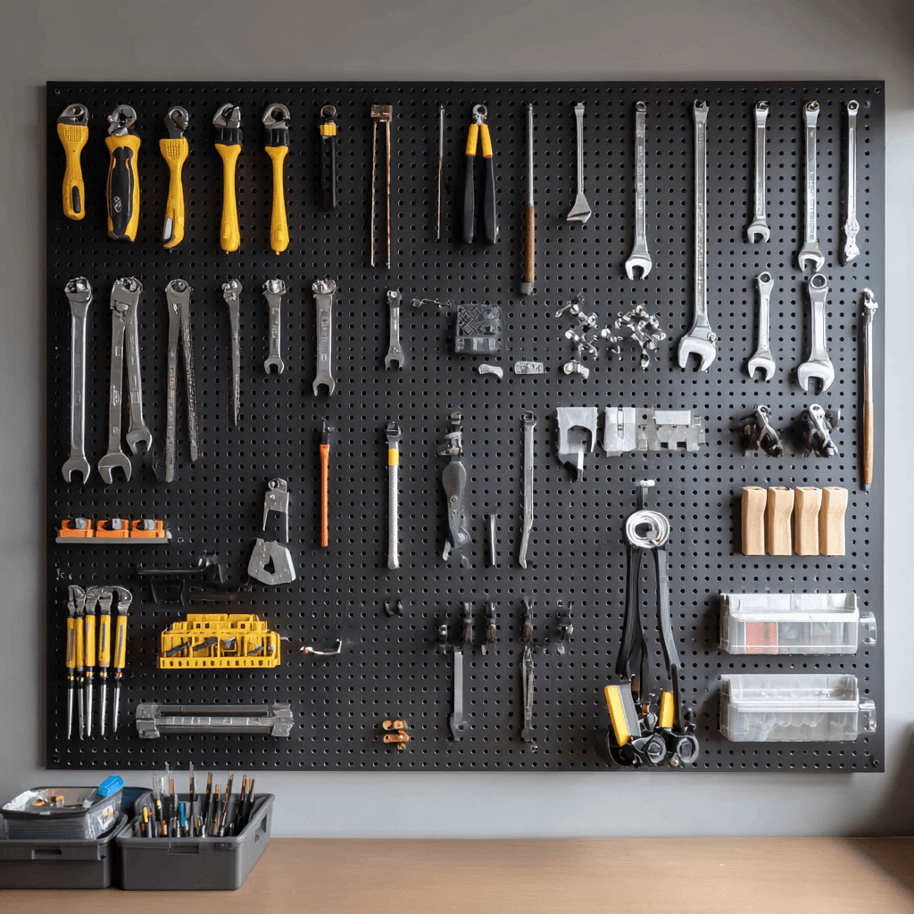 If your tools are scattered everywhere, a vertical tool wall will change your life. This setup uses pegboards, slat walls, or rail systems to store tools upright instead of piled up.