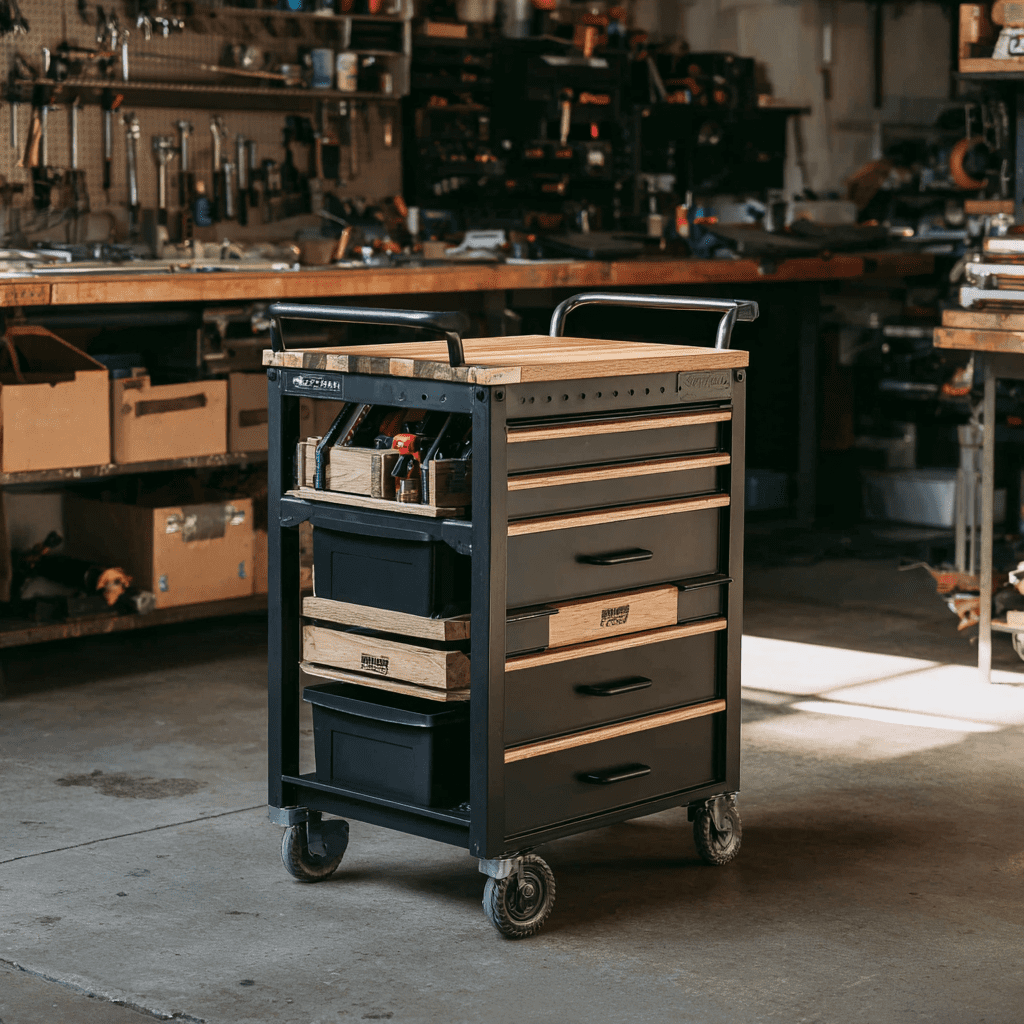 A rolling tool cart gives you flexible storage that moves with you. It’s especially handy when your garage layout needs to change often.