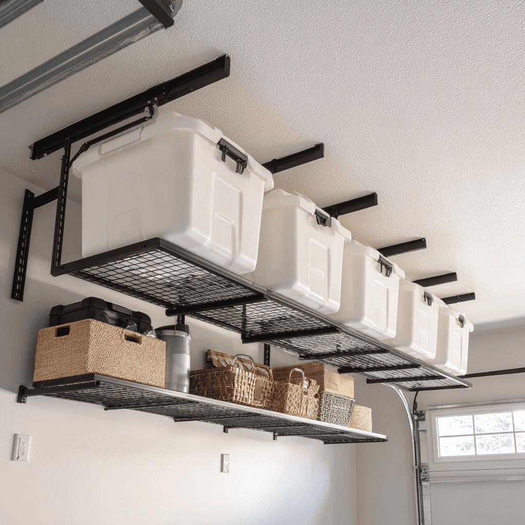 Ceiling racks store bulky items you don’t use daily, like lumber, bins, or seasonal tools.