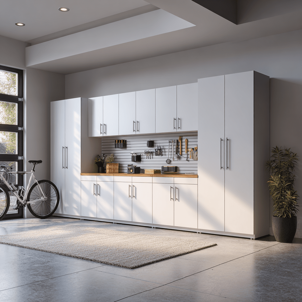 Wall-mounted cabinets keep your floor clear while hiding clutter. They’re perfect for small garages that feel visually busy.