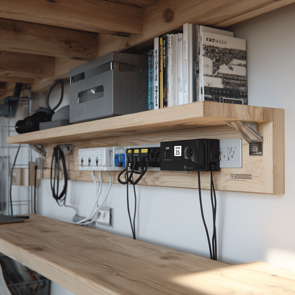 Power access is always annoying in garages. Mounting power strips under shelves keeps cords off the floor and tools ready to go.