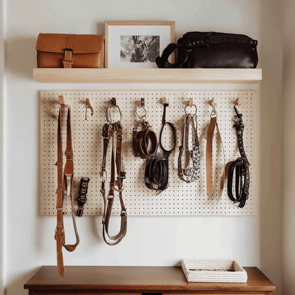 This is your all-in-one zone for daily pet essentials. Think leashes, harnesses, poop bags, and even a small treat jar. Mount a pegboard or hook rail near the door so everything you need is grab-and-go.