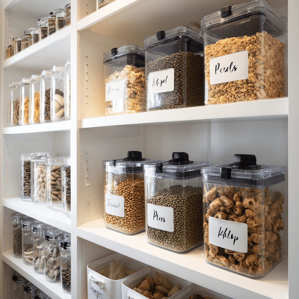 Bulky food bags are messy and hard to manage. Transfer kibble, treats, and supplements into clear, airtight bins instead. Stack them neatly in a pantry or corner.