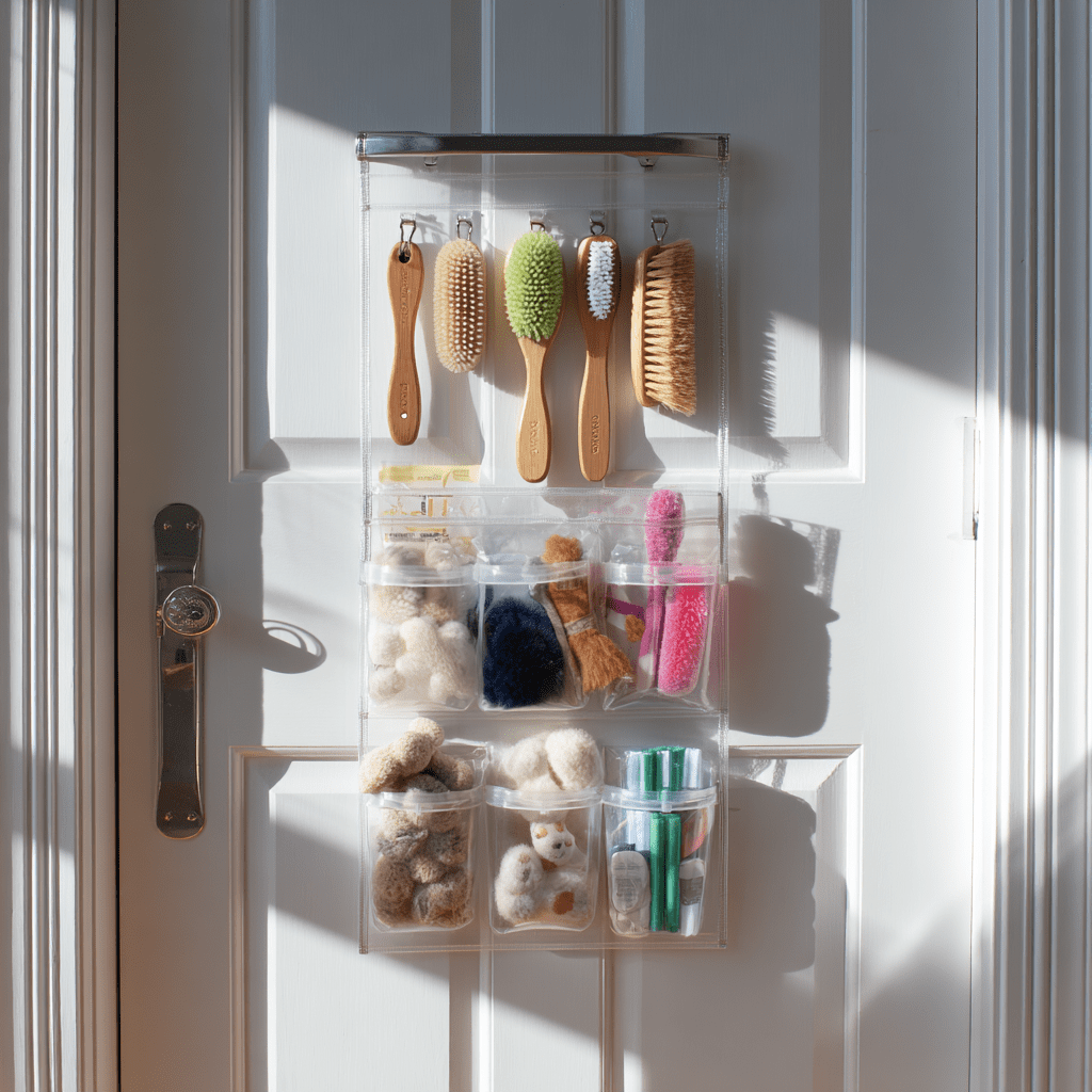 That unused door space is gold. Hang a shoe organizer and use the pockets for brushes, nail clippers, treats, and small toys.