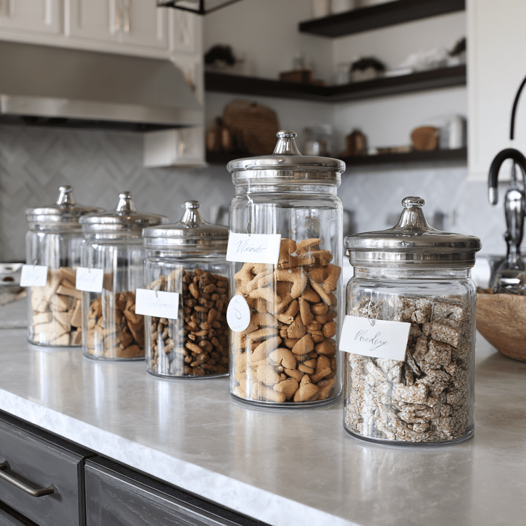 Treat bags are messy and noisy. Pour them into cute jars and keep them in one spot, preferably near your training area.