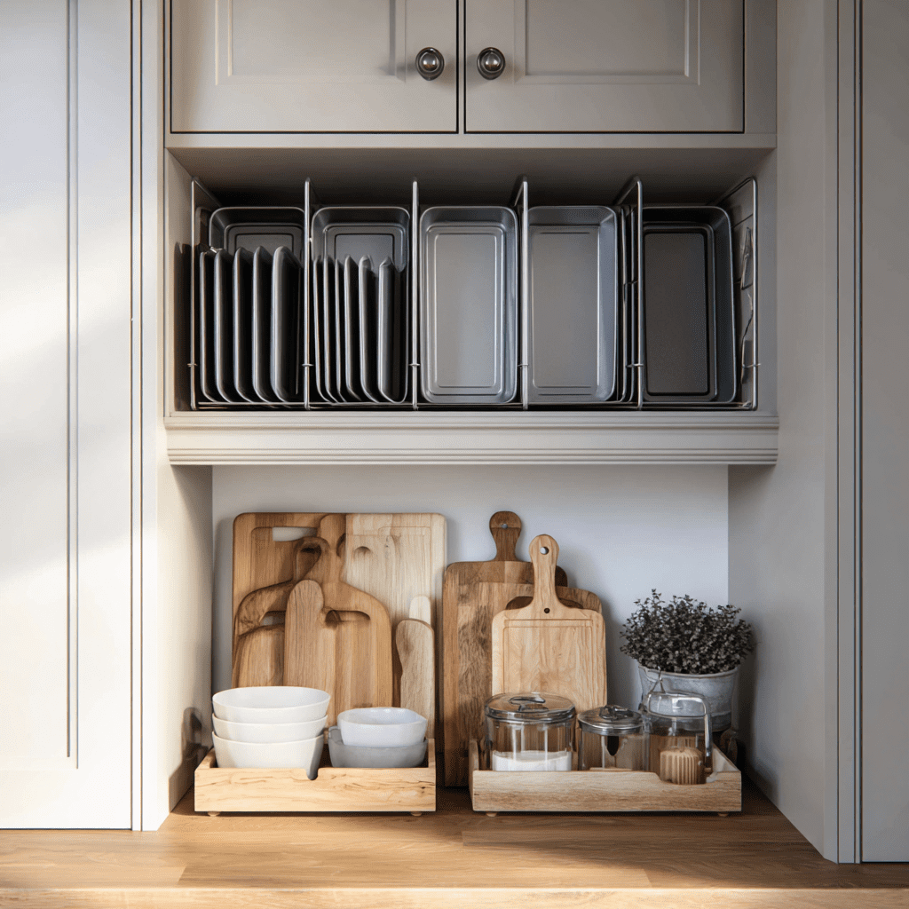 They store trays, cutting boards, and muffin tins upright, making everything easy to grab. No more noisy avalanches.