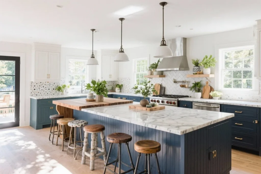 Let’s tour ten complete, totally distinct kitchen island looks you can steal. Each one has its own vibe, from coastal calm to city chic. Picture yourself cooking, hosting, and living around these designs—you’ll know which one is yours by the end.
