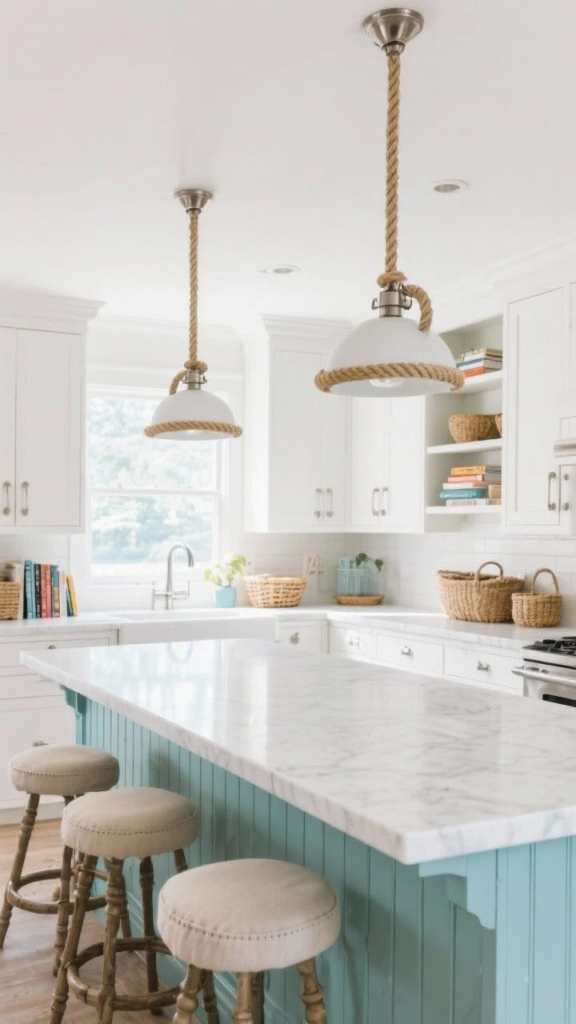 Pair it with rope-wrapped pendant lights, brushed nickel hardware, and cafe-style barstools upholstered in sandy linen. The perimeter cabinets stay white, while the island brings in the coastal color moment.