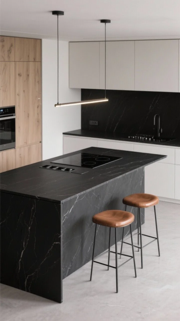 Make a statement with a sleek, matte black waterfall island that looks like it was carved from a single block. The countertop and sides are honed black granite or porcelain for that velvety look.