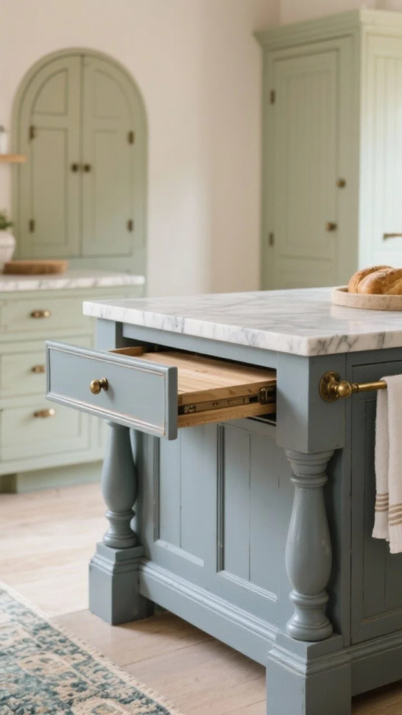 This island looks like a beloved antique. Go for a warm gray-blue painted base with turned legs, a marble top, and aged brass cup pulls.