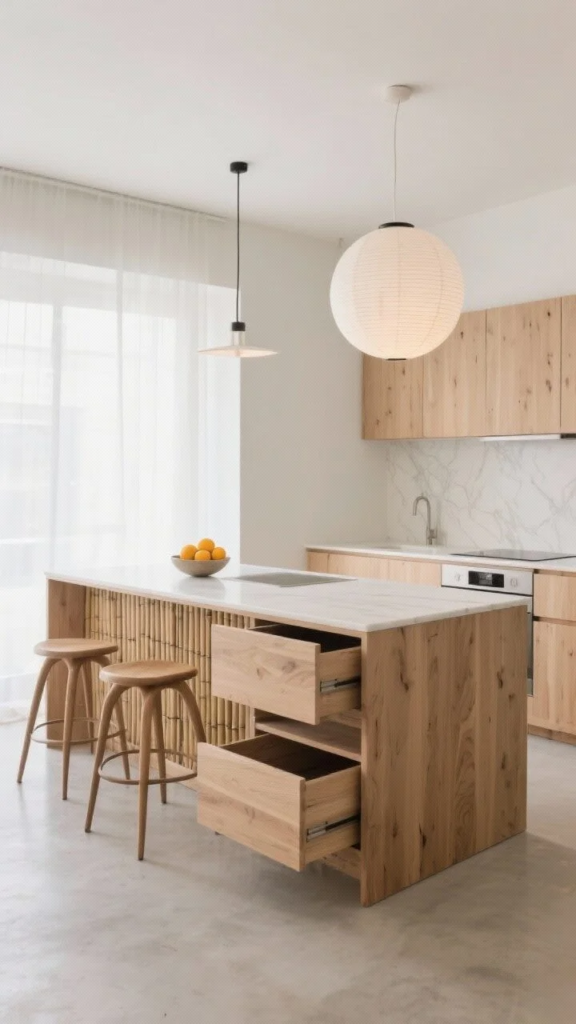 Pair it with flat-panel cabinets in mushroom beige, arched plaster hood, and simple cone pendants. Keep decor minimal: a ceramic bowl, a branch, a linen runner.